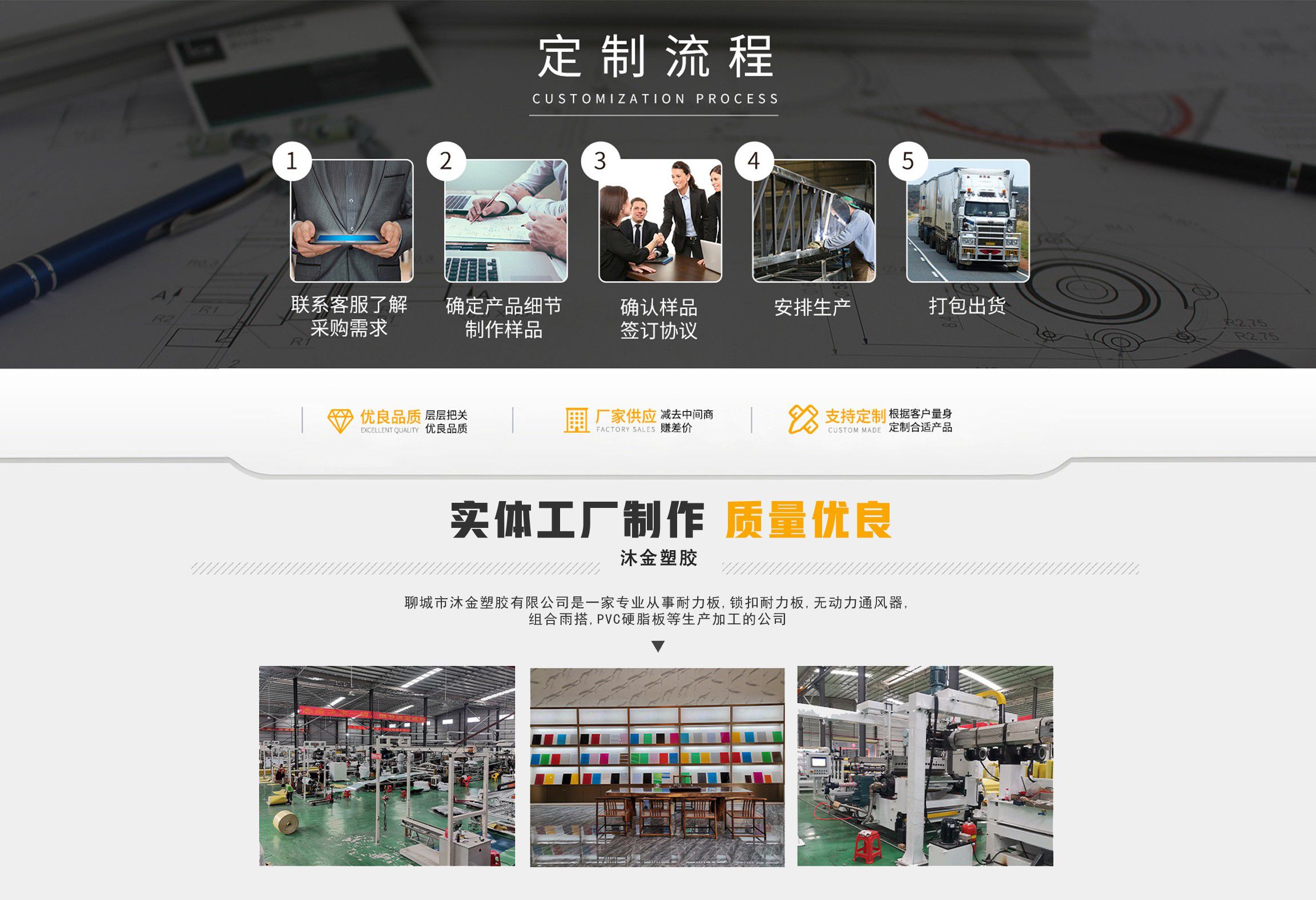 聊城市沐金塑膠有限公司注冊資金2180萬元,占地20000余平方,擁有自建廠房15000平方,員工100余名。10余年來,公司主營耐力板,鎖扣耐力板,耐力板深加工,無動力通風器,組合雨搭,PVC硬脂板,耐力板廠家等板材的發(fā)展戰(zhàn)略,逐漸成長為綜合性企業(yè)。 公司擁有多條板材共擠生產(chǎn)線,采用世界知名品牌進口原材料和先進工藝,依據(jù)完善的ISO9001質(zhì)量管理體系和ISO14001環(huán)境管理體系,為產(chǎn)品的卓越品質(zhì)提供了強有力的保證。憑借過硬的創(chuàng)新能力和堅實的硬件基礎(chǔ),贏創(chuàng)已成為國內(nèi)領(lǐng)先的熱塑性板材生產(chǎn)商,產(chǎn)品被廣泛應(yīng)用于建筑業(yè)、農(nóng)業(yè)、工業(yè)、廣告業(yè)、安防行業(yè)及DIY領(lǐng)域。 公司始終致力于通過提供最優(yōu)的板材應(yīng)用解決方案,為客戶創(chuàng)造最高的價值;堅守創(chuàng)新、質(zhì)量、靈活、服務(wù)和速度的核心價值觀;堅持“完美的產(chǎn)品需要完美服務(wù)的支持”的經(jīng)營理念,努力實現(xiàn)成為世界領(lǐng)先的板材與解決方案供應(yīng)商的夢想。 在未來,公司將立足客戶需求,不斷改變和完善現(xiàn)有產(chǎn)品,拓展產(chǎn)品線和充分開發(fā)板材的應(yīng)用領(lǐng)域,為客戶創(chuàng)造全方位的價值。同時更好地實現(xiàn)員工的價值,實現(xiàn)公司團隊的價值。我們將與您一起創(chuàng)贏未來! 企業(yè)使命:成為世界領(lǐng)先的板材與解決方案供應(yīng)商。 公司愿景:通過提供最優(yōu)的板材應(yīng)用解決方案,為客戶創(chuàng)造最高的價值。 核心價值觀:質(zhì)量...